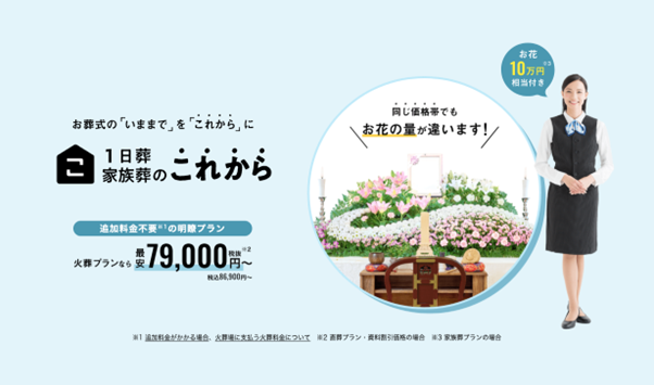 「1日葬・家族葬のこれから」は、これまで一般的だった高額な葬儀の常識を見直し、これからの時代に合わせた適正な規模と価格で全国に家族葬を展開しています。 費用を抑えながらも立派にお見送りしたい方におすすめの家族葬サービスです。